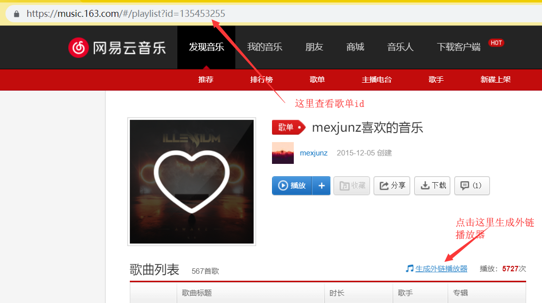 此时,如果你的歌单里包含没有版权的歌曲,网页会提示是无法生成外链播放器。这时看我图示标注的歌单id,把生成的外链中的id参数替换掉就行,即使这样,没有版权的歌曲还是无法播放的,但是聊胜于无嘛。当然,自己建立一个博客专用歌单也是阔以的。这个外链播放器我们可以选择插入到网页中,也可以直接在博客的markdown内插入。